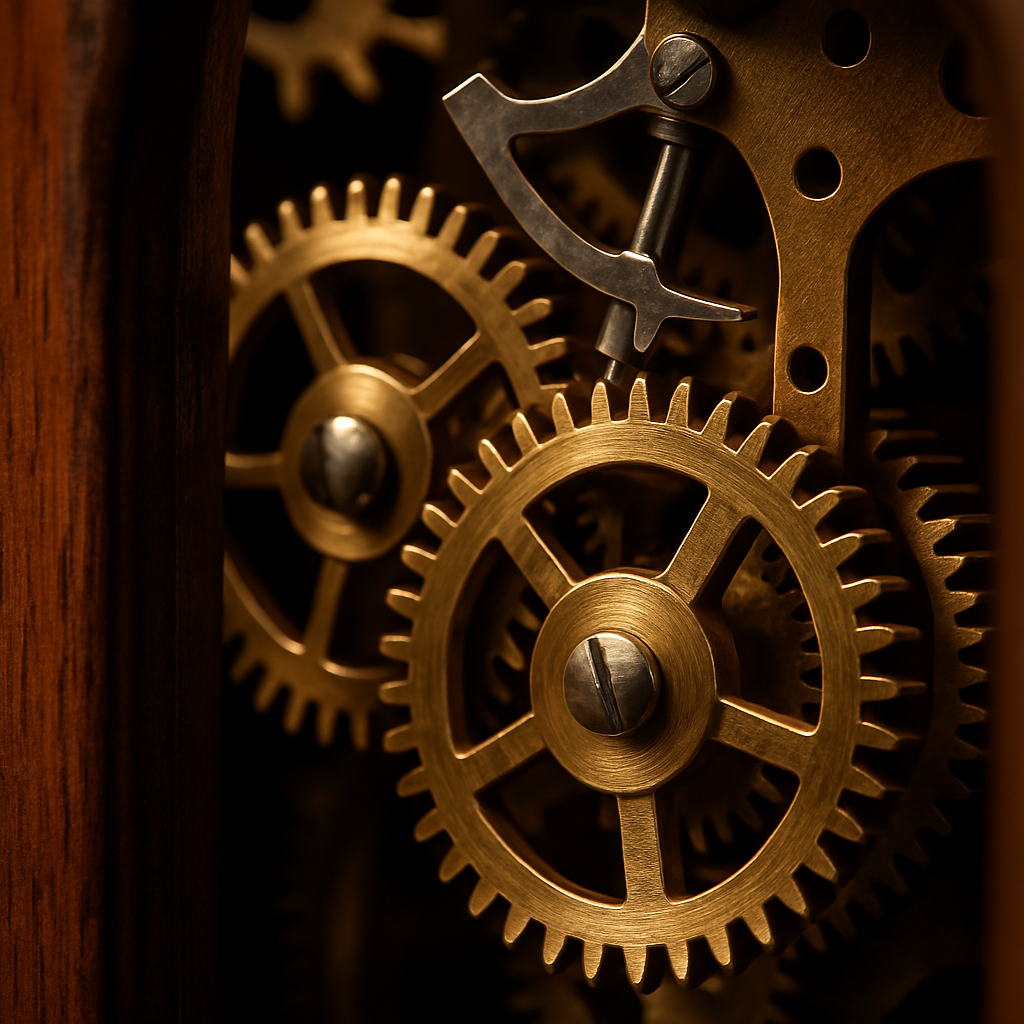 The grandfather clock’s motor is a precision movement powered by gravity. As the weights slowly descend, they drive gears regulated by a swinging pendulum. Each swing releases the escapement—creating that classic tick-tock rhythm and perfect timekeeping.