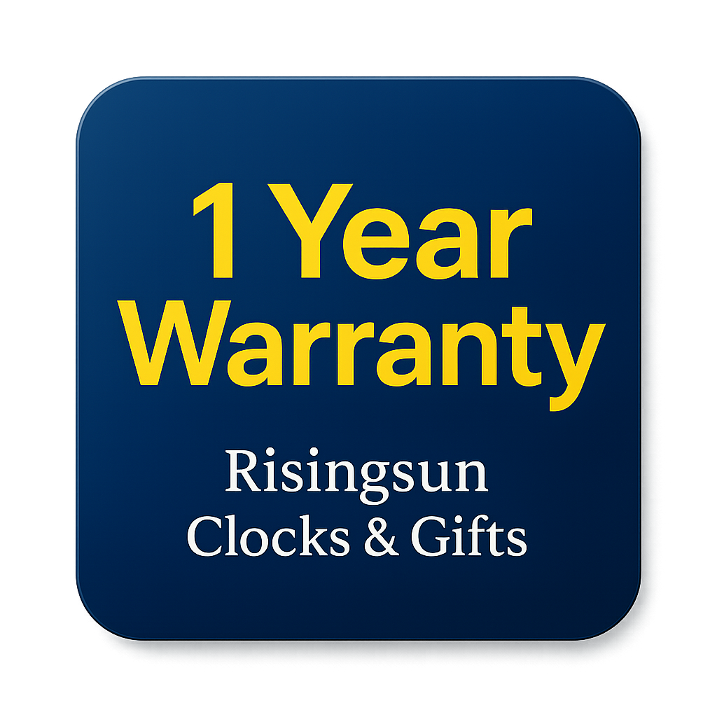 At RisingSun Clocks & Gifts, we take pride in the quality and craftsmanship of every product we offer. Each clock and gift item is backed by our 1-Year Limited Warranty, ensuring your purchase is protected and built to last.